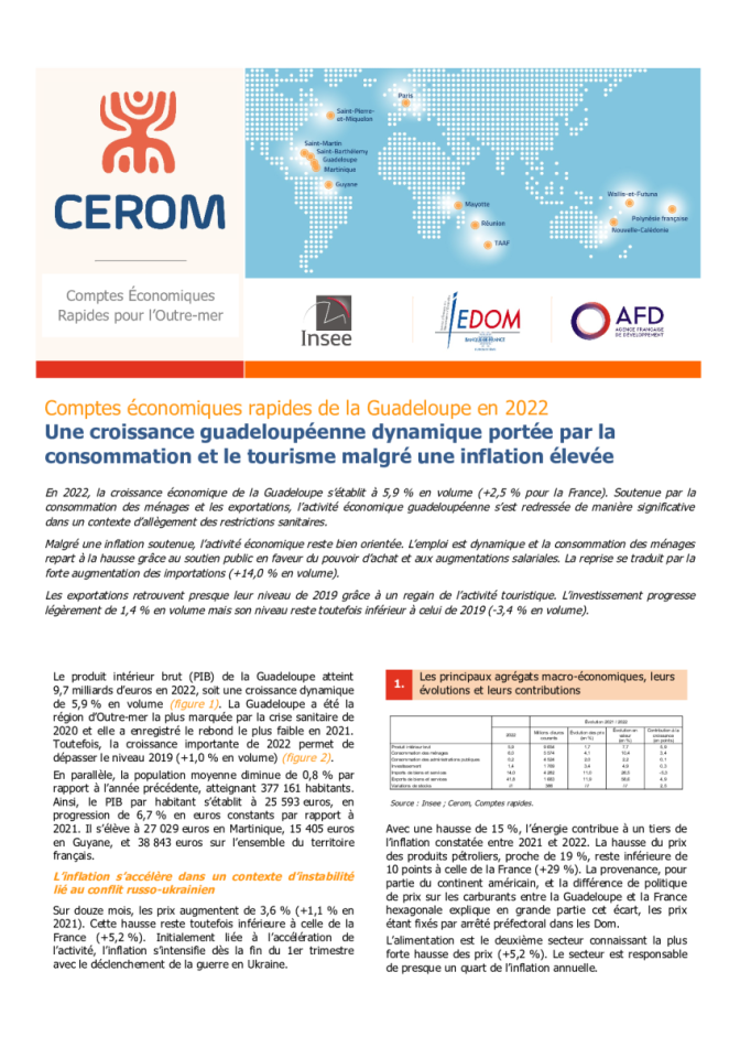En 2022, la croissance économique de la Guadeloupe s’établit à 5,9 % en volume (+2,5 % pour la France). Soutenue par la consommation des ménages et les exportations, l’activité économique guadeloupéenne s’est redressée de manière significative dans un contexte d’allègement des restrictions sanitaires.
