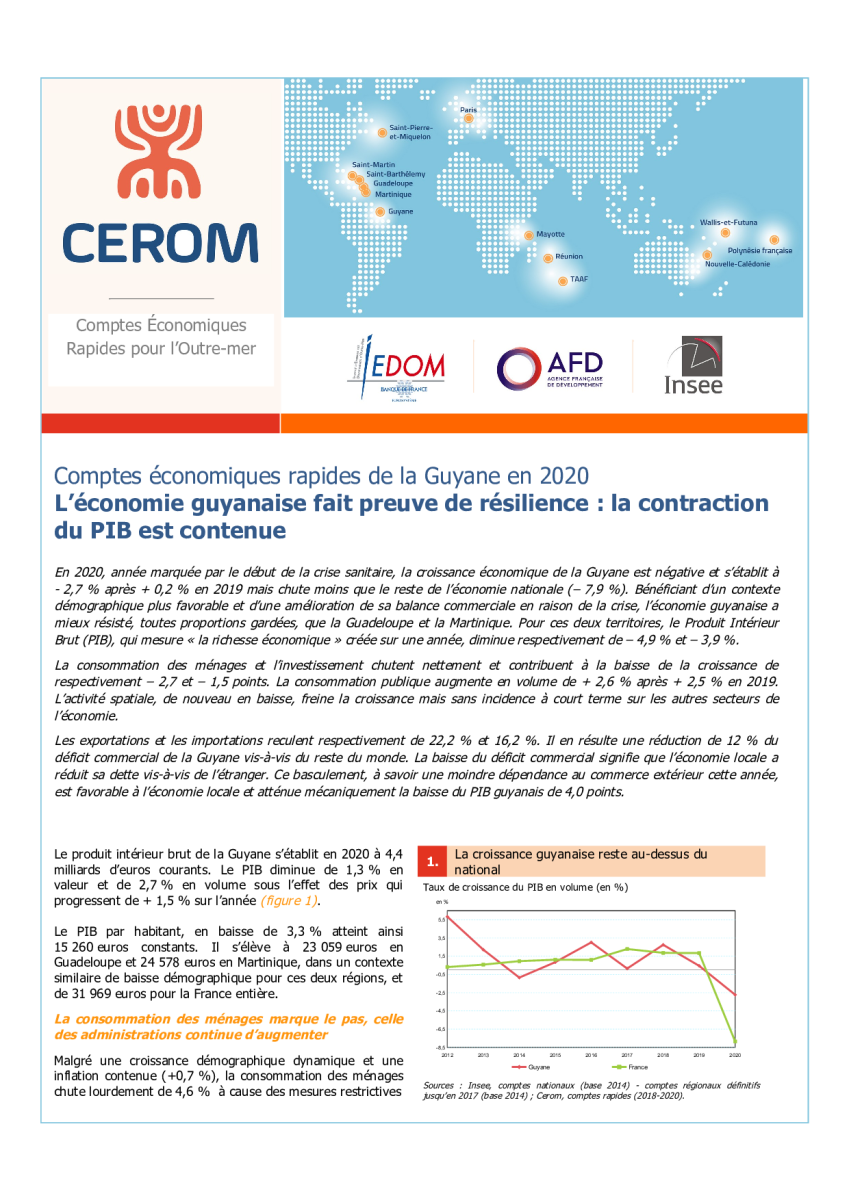 En 2020, année marquée par le début de la crise sanitaire, la croissance économique de la Guyane est négative et s’établit à- 2,7 % après + 0,2 % en 2019 mais chute moins que le reste de l’économie nationale (– 7,9 %). Bénéficiant d’un contexte démographique plus favorable et d’une amélioration de sa balance commerciale en raison de la crise, l’économie guyanaise a mieux résisté, toutes proportions gardées, que la Guadeloupe et la Martinique. Pour ces deux territoires, le Produit Intérieur Brut (PIB), qui mesure « la richesse économique » créée sur une année, diminue respectivement de – 4,9 % et – 3,9 %. La consommation des ménages et l’investissement chutent nettement et contribuent à la baisse de la croissance de respectivement – 2,7 et – 1,5 points. La consommation publique augmente en volume de + 2,6 % après + 2,5 % en 2019. L’activité spatiale, de nouveau en baisse, freine la croissance mais sans incidence à court terme sur les autres secteurs de l’économie. Les exportations et les importations reculent respectivement de 22,2 % et 16,2 %. Il en résulte une réduction de 12 % du déficit commercial de la Guyane vis-à-vis du reste du monde. La baisse du déficit commercial signifie que l’économie locale a réduit sa dette vis-à-vis de l’étranger. Ce basculement, à savoir une moindre dépendance au commerce extérieur cette année, est favorable à l’économie locale et atténue mécaniquement la baisse du PIB guyanais de 4,0 points.