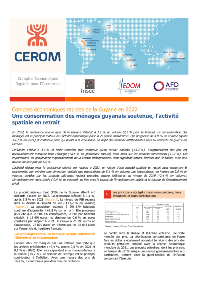 L’activité résiste mais la croissance ralentit par rapport à 2021, en raison d’une activité spatiale en retrait avec seulement 6 lancements, qui entraîne une diminution globale des exportations de 5,1 % en volume. Les importations, en hausse de 2,9 % en volume, portées par les produits pétroliers restent toutefois encore inférieures au niveau de 2019 (-2,4 % en volume). L’investissement reste stable (-0,4 % en volume), en lien avec la baisse de l’investissement public et la hausse de l’investissement privé.