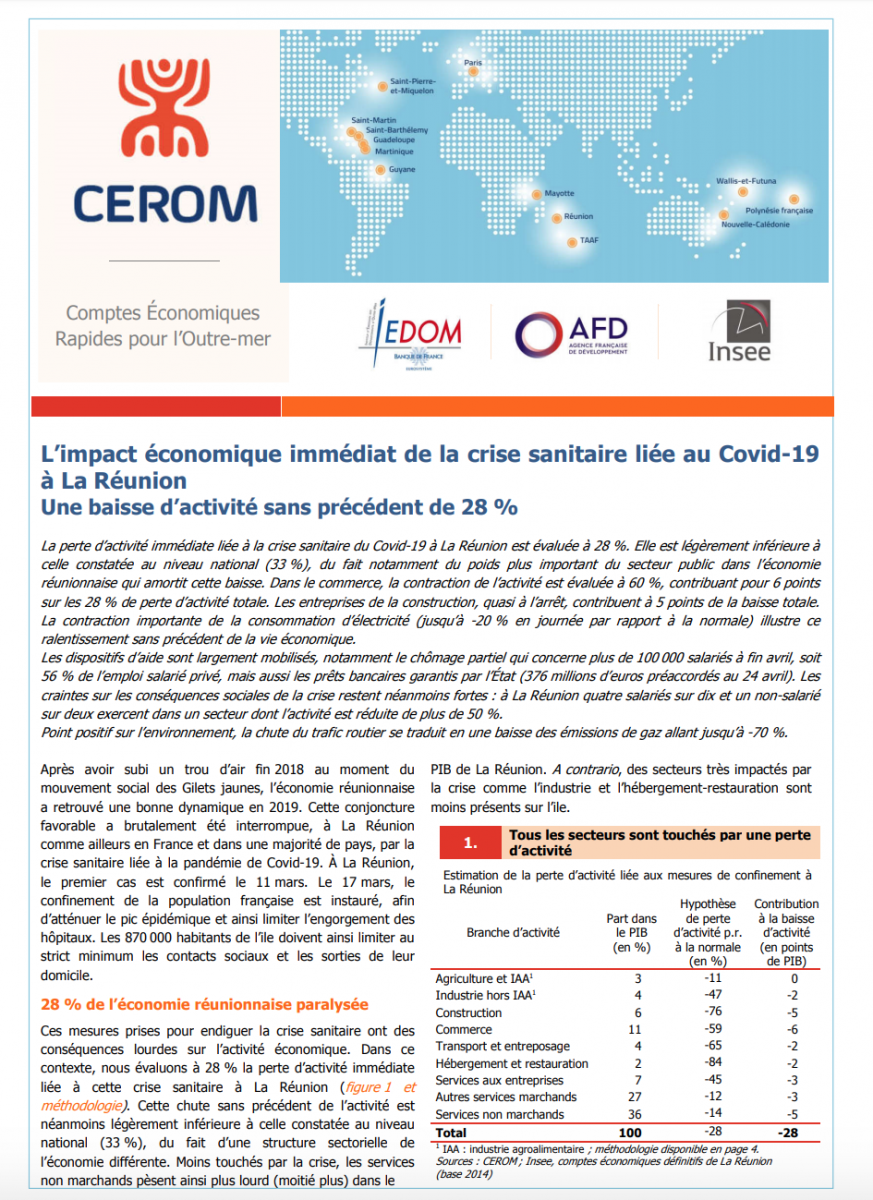 La perte d’activité immédiate liée à la crise sanitaire du Covid-19 à La Réunion est évaluée à 28 %. Elle est légèrement inférieure à celle constatée au niveau national (33 %), du fait notamment du poids plus important du secteur public dans l’économie réunionnaise qui amortit cette baisse. Dans le commerce, la contraction de l’activité est évaluée à 60 %, contribuant pour 6 points sur les 28 % de perte d’activité totale. Les entreprises de la construction, quasi à l’arrêt, contribuent à 5 points de la baisse totale. La contraction importante de la consommation d’électricité (jusqu’à -20 % en journée par rapport à la normale) illustre ce ralentissement sans précédent de la vie économique.