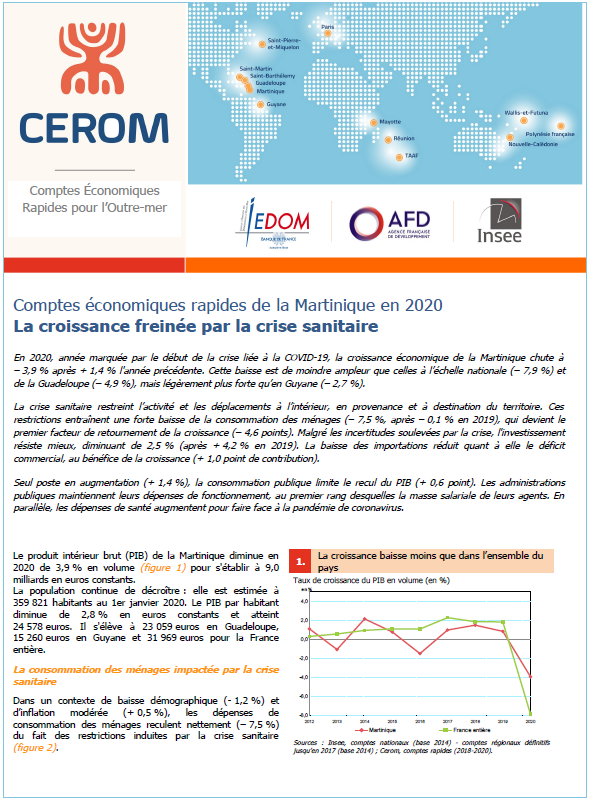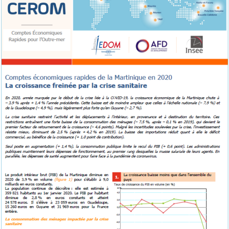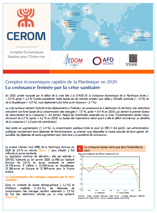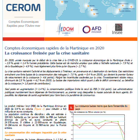 En 2020, année marquée par le début de la crise liée à la COVID-19, la croissance économique de la Martinique chute à – 3,9 % après + 1,4 % l’année précédente. Cette baisse est de moindre ampleur que celles à l’échelle nationale (– 7,9 %) et de la Guadeloupe (– 4,9 %), mais légèrement plus forte qu’en Guyane (– 2,7 %).