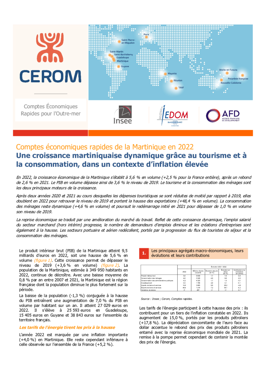 En 2022, la croissance économique de la Martinique s’établit à 5,6 % en volume (+2,5 % pour la France entière), après un rebond de 2,6 % en 2021. Le PIB en volume dépasse ainsi de 3,6 % le niveau de 2019. Le tourisme et la consommation des ménages sont les deux principaux moteurs de la croissance.