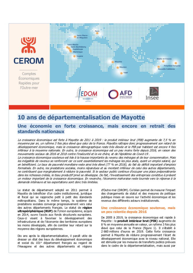 La croissance économique est forte à Mayotte de 2011 à 2019 : le produit intérieur brut (PIB) augmente de 7,5 % en moyenne par an, un rythme 3 fois plus élevé que celui de la France. Mayotte rattrape donc progressivement son retard de développement économique, mais la croissance démographique reste très élevée et le PIB par habitant est encore 4 fois inférieur à la moyenne nationale. En outre, la croissance économique est un peu moins forte depuis 2016, en raison des mouvements sociaux de 2016 et 2018 contre /’insécurité et la vie chère, et de l’épidémie de Covid-19.