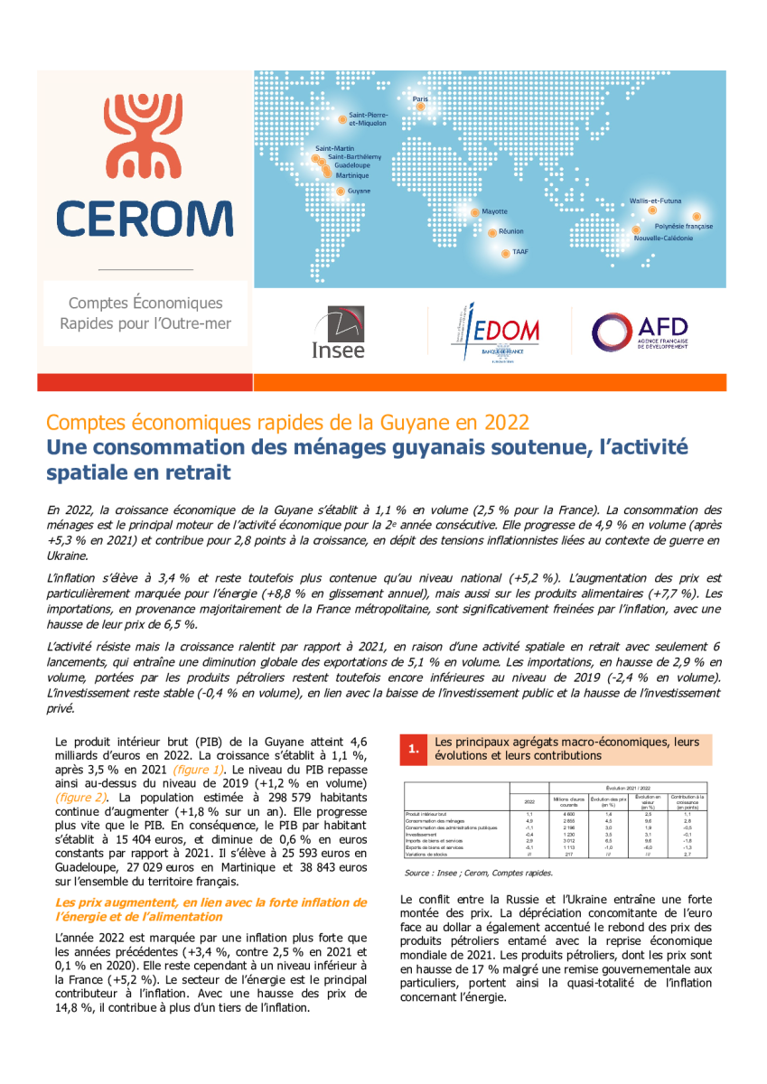 En 2022, la croissance économique de la Guyane s’établit à 1,1 % en volume (2,5 % pour la France). La consommation des ménages est le principal moteur de l’activité économique pour la 2ᵉ année consécutive. Elle progresse de 4,9 % en volume (après +5,3 % en 2021) et contribue pour 2,8 points à la croissance, en dépit des tensions inflationnistes liées au contexte de guerre en Ukraine.