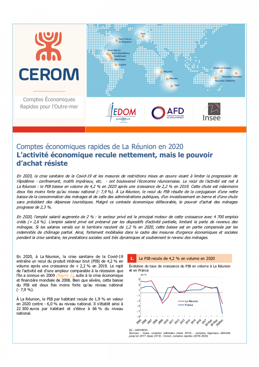 En 2020, la crise sanitaire de la Covid-19 et les mesures de restrictions mises en œuvre visant à limiter la progression de l’épidémie - confinement, motifs impérieux, etc. - ont bouleversé l’économie réunionnaise. Le recul de l’activité est net à La Réunion : le PIB baisse en volume de 4,2 % en 2020 après une croissance de 2,2 % en 2019. Cette chute est néanmoins deux fois moins forte qu’au niveau national (- 7,9 %). À La Réunion, le recul du PIB résulte de la conjugaison d’une nette baisse de la consommation des ménages et de celle des administrations publiques, d’un investissement en berne et d’une chute sans précédent des dépenses touristiques. Malgré ce contexte économique défavorable, le pouvoir d’achat des ménages progresse de 2,3 %.