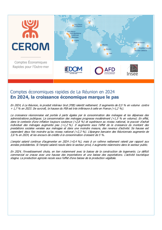 En 2024, à La Réunion, le produit intérieur brut (PIB) ralentit nettement. Il augmente de 0,5 % en volume contre