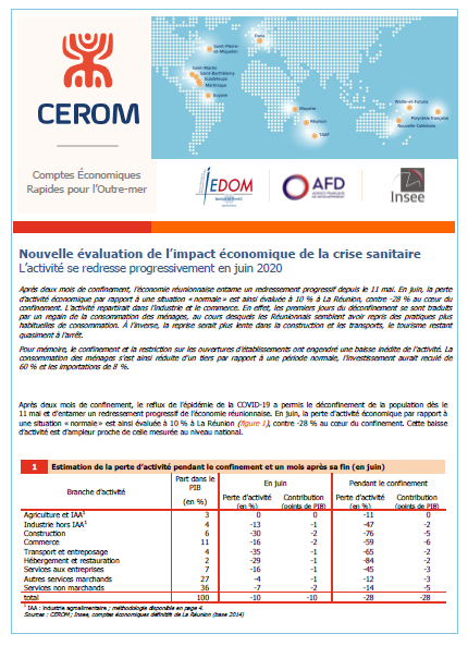 Après deux mois de confinement, l’économie réunionnaise entame un redressement progressif depuis le 11 mai. En juin, la perte d’activité économique par rapport à une situation « normale » est ainsi évaluée à 10 % à La Réunion, contre -28 % au coeur du confinement. L’activité repartirait dans l’industrie et le commerce. En effet, les premiers jours du déconfinement se sont traduits par un regain de la consommation des ménages, au cours desquels les Réunionnais semblent avoir repris des pratiques plus habituelles de consommation. À l’inverse, la reprise serait plus lente dans la construction et les transports, le tourisme restant quasiment à l’arrêt.