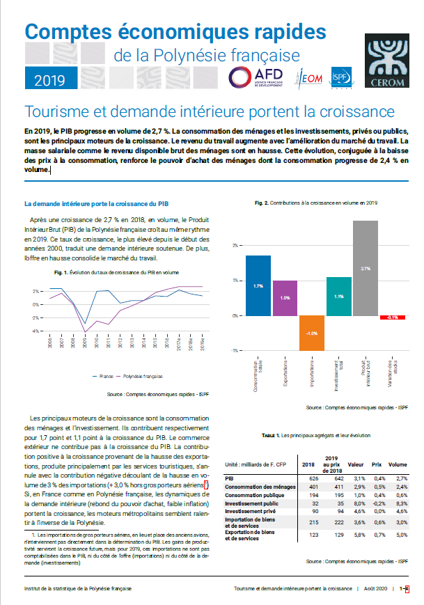 En 2019, le PIB progresse en volume de 2,7 %. La consommation des ménages et les investissements, privés ou publics, sont les principaux moteurs de la croissance. Le revenu du travail augmente avec l’amélioration du marché du travail. La masse salariale comme le revenu disponible brut des ménages sont en hausse. Cette évolution, conjuguée à la baisse des prix à la consommation, renforce le pouvoir d’achat des ménages dont la consommation progresse de 2,4 % en volume.