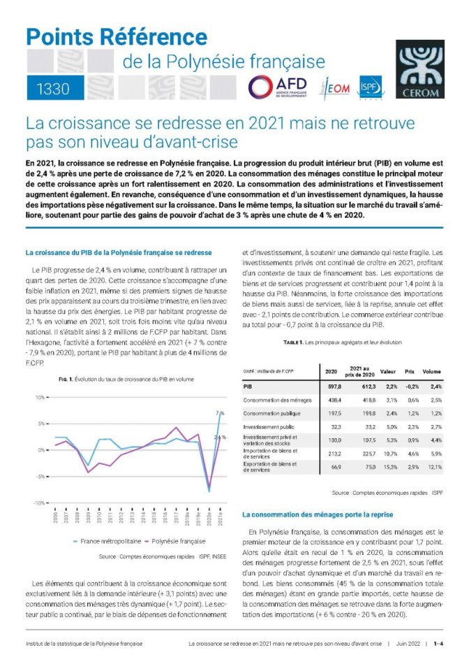En 2021, la croissance se redresse en Polynésie française. La progression du produit intérieur brut (PIB) en volume est de 2,4 % après une perte de croissance de 7,2 % en 2020. La consommation des ménages constitue le principal moteur de cette croissance après un fort ralentissement en 2020. La consommation des administrations et l’investissement augmentent également. En revanche, conséquence d’une consommation et d’un investissement dynamiques, la hausse des importations pèse négativement sur la croissance. Dans le même temps, la situation sur le marché du travail s’améliore, soutenant pour partie des gains de pouvoir d’achat de 3 % après une chute de 4 % en 2020.