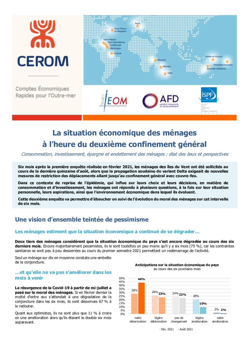 Six mois après la première enquête réalisée en février 2021, le CEROM a interrogé les ménages des îles du Vent au cours de la dernière quinzaine d’août. L’étude aborde l’évolution de la situation économique et financière des ménages, ainsi que leurs anticipations d’achats, d’investissement et d’épargne pour les mois à venir.